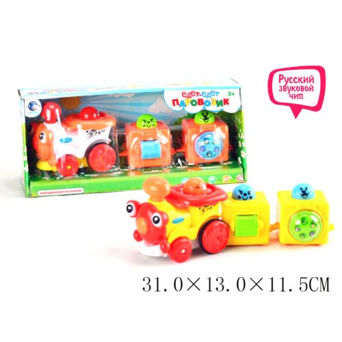Інерційна іграшка паровозик із вагонами. Вагони мають рухомі елементи, які можна з’єднувати між собою. У паровозика є різнобарвне підсвічування, а також грає весела пісенька російською мовою. Для дітей чи 3-х років.