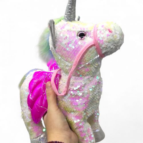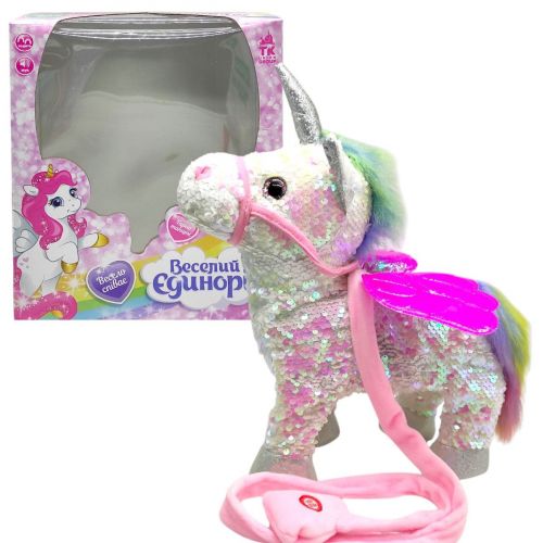 Чарівний та миловидний дизайн милої конячки з крилами вражає уяву та радує око! Казковий пегас вміє ходити, цокати копитами, танцювати, що точно вразить кожну юну принцесу! Всі кумедні дії скакуна супроводжуються веселою пісенькою англійською мовою. Управління милою конячкою здійснюється дистанційно, через пульт-повідець. Такий славний вихованець даруватиме лише теплі спогади та позитивні емоції! Славний єдиноріжок покритий блискучими двосторонніми паєтками, а розгонисті крильця відрізняються стильним перламутровим забарвленням.