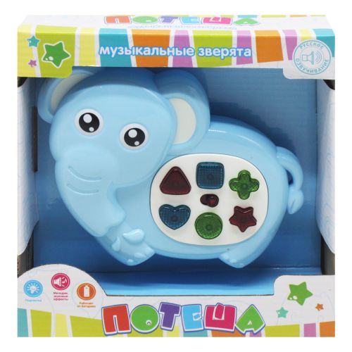 Інтерактивна іграшка “Слонік”. Іграшка озвучена російською мовою. Навчальна іграшка відтворює веселі мелодії, цифри від 1 до 5, озвучує геометричні фігури, розповідає цікаві факти. Є різнокольорове підсвічування кнопок. Іграшка розвиває пам’ять, дрібну моторику, колірне та сенсорне сприйняття.
