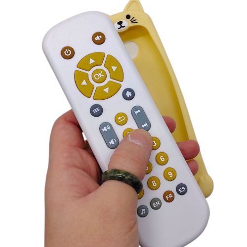Кумедний ігровий пульт допоможе малюкові весело вивчати звуки, мелодії, мови та цифри. Завдяки підсвічуванню як у справжньому пульті, музичним режимам та різним мовам озвучування дитина із захопленням натискатиме кнопочки, вивчатиме нові звуки та повторюватиме цифри. Мʼякі гумові кнопки зручні для маленьких пальчиків, а яскравий дизайн робить гру ще приємнішою. Такий пульт відмінно підходить для розвитку сенсорики, уваги та раннього навчання. Озвучування цифр англійською, іспанською та французькою мовами; Розмір пульта: 5,5 х17 см; Кнопка з нотою слугує перемикачем режимів звуку; Поміщений у гумовий чохол у вигляді звірятка. Працює від 2 батарейок типу ААА (у комплект не входять).