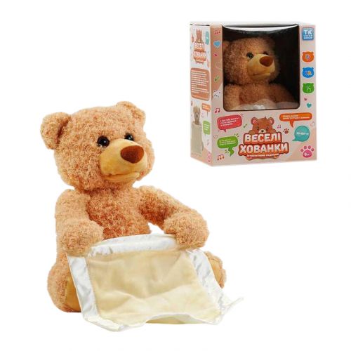 Натисніть на лапку мʼякого ведмедика і він пограє з дитиною в гру “Ку-Ку”, ховаючись за ковдрою. Ведмідь ідеально підходить для малюків, тому що він сприяє сенсорній грі, візуальному розвитку. Малюк буде сміятися від захоплення, коли ведмедик підніматиме і опускатиме свою ковдру, відтворюючи інтерактивну гру в хованки. Українською мовою. Розмір – 31 см.