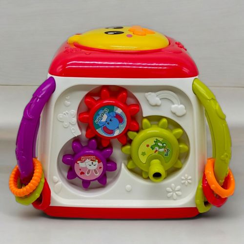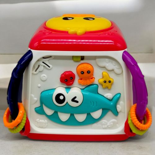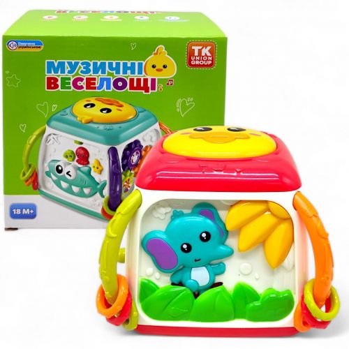 Інтерактивний мультибокс “Музичні веселощі” — це яскрава та цікава іграшка у вигляді кубика, на кожній грані якого є різні ігри для розвитку дитини. На двох гранях розташовані пальчикові ігри, на інших — рухливі шестерні та морські мешканці, які співають, розповідають казки та мелодії. Особливо цікава сторона з акулою, де можна порахувати її зуби. Іграшка також має качечку зверху, яка відтворює звуки барабанів і підсвічується. Працює від 3 батарейок типу AA (немає в комплекті). Допомагає розвивати моторику, зір, слух і координацію. Українською мовою.
