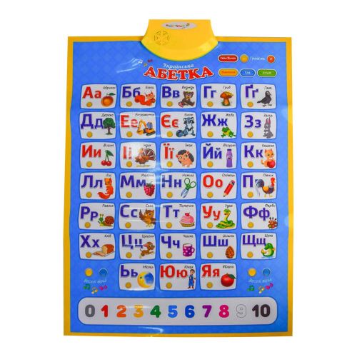 Інтерактивний плакат “Абетка”. У плаката є безліч функцій, які дозволять малюкові легко, в ігровій формі вивчати букви і звуки української мови. Функціонал: “Веселі вірші” – за натисканням кнопки слід той чи інший віршик; “Букви” – після натискання кнопки плакат починає вимовляти всі букви алфавіту і назви малюнків по черзі; “Звуки” – вивчення голосних і приголосних звуків (на плакаті позначені синім і червоним кольором); “Іспит” – називається буква, яку потрібно знайти. Розмір плаката – 45х60 см. Працює від 3-х батарейок ААА (немає в наявності).