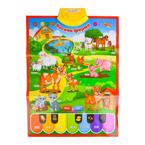 Інтерактивний плакат. Відмінно підійде для вивчення домашніх тварин. Функції: “Вчимо назви тварин”; “Відгадай загадку”; “Голоси тварин”; гра ( “Де чия мама?” / “Так чи ні”). Є кнопка вкл / викл і кнопки регулювання гучності. Розмір плаката: 45х60 см.