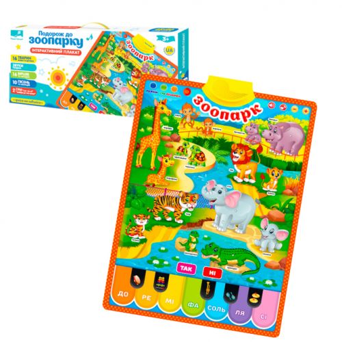 Плакат інтерактивний, який навчає “Зоопарк”. Сенсорні кнопки, вологостійка поверхня, можливість розмістити як на столі, так і стіні. Плакат розповідає про 16 тварин мам та їхніх дітей, 16 віршів та загадок, 10 пісень та мелодій, 2 ігри “Так” або “Ні” та “Знайди, де чия мама”. Також є кнопки з нотами (7 нот). 3 режими: вивчення, гра та іспит. Українською мовою. Розмір плаката 45х60 см.