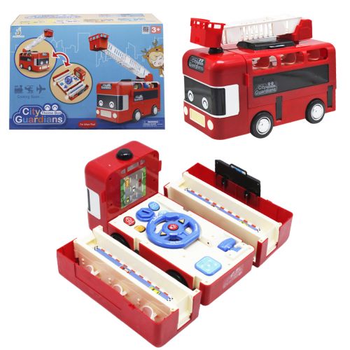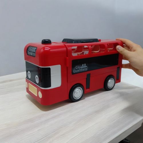 Музичний автобус – оригінальна інтерактивна іграшка, яка обовʼязково порадує дитину. Автобусом можна грати як у закритому вигляді, так і у відкритому. Відкривши його, можна дослідити багато цікавих функцій: усередині знаходиться рухоме кермо з кнопками “вправо” і “вліво”, проїзна карта та магнітне поле для неї, ключ запалення та кнопки, натискаючи на які, можна почути цікаві навчальні факти про дорожні правила англійською мовою. У комплекті є підйомник, який кріпиться до даху автобуса.