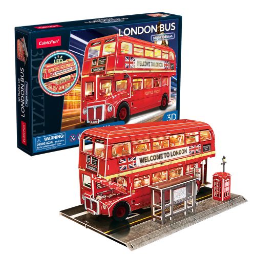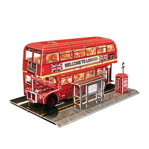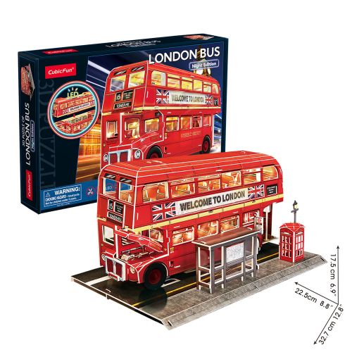 CubicFun Тривимірна головоломка-конструктор з LED підсвіткою «Лондонський автобус» сподобається юним архітекторам. Лондонський двоповерховий автобус – це живий символ міста, який переносить у минуле та одночасно в майбутнє. Стукіт коліс, гул мотора, та чудовий вид з верхнього ярусу – це справжній досвід Лондона. Розмір готової моделі становить 32.7 x 22.5 x 17.5 см. Для живлення потрібні 2 батарейки типу AАА (немає в комплекті). Рекомендовано для дітей від 8-ми років.