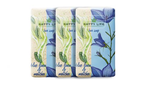 Тверде мило Happy Life з екстрактами синього льону та матчу призначене для щоденного очищення шкіри. При намоканні створює густу кремову піну, яка ефективно видаляє забруднення, залишаючи шкіру м’якою і свіжою. Натуральні компоненти, включаючи екстракти матчу та насіння льону, мають пом’якшувальну та зволожуючу дію. Аромат зберігається після використання. Кожне мило упаковано індивідуально.