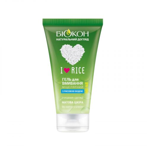 Гель для вмивання Біокон I love rice містить 100% натуральну рисову воду та комплекс очисних міцел. Очищає шкіру, змиває з її поверхні забруднення, токсини та надлишки шкірного себуму. Не містить мила й агресивних речовин. Позбавляє шкіру жирного блиску та робить її ідеально матовою. Рисова вода доглядає за шкірою під час вмивання, зберігає мʼякість і ніжність шкірного покриву. Алое надає зволожувальну та заспокійливу дію.