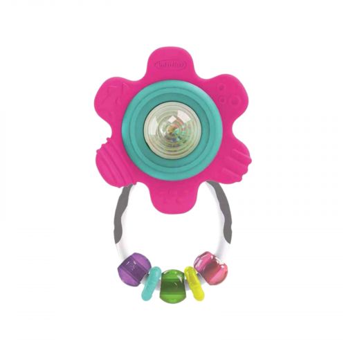 Пелюстки квітки виготовлені з мʼякого текстурованого матеріалу і ідеально підходять для масажу ясен під час прорізування зубів. Іграшка-брязкальце має всередині намистини, які гримлять. Ручка іграшки виконана з намистин різного кольору.