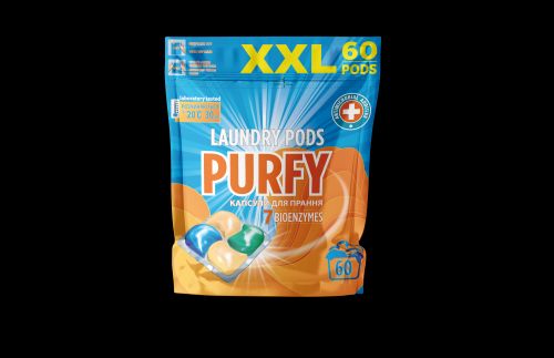 Капсули Purfy– це більше ніж якісне прання. Це продукт Все в 1. Він забезпечує догляд за речами (колір, стан тканини та ін), заощаджує ресурси і час, надає можливість не сортувати речі Висококонцентрована іноваційна формула, що включає ензими, бустери, кондиціонер, інгібітор переносу барвника забеспечує не тільки якісне прання,а й виведення складних плям, догляд за кольором і станом тканини. Відсутність разводів. Вміст капсули легко розчиняється у воді і виполіскуєсться з тканини. Ефективний при низьких температурарах, навіть при 20 ° С.