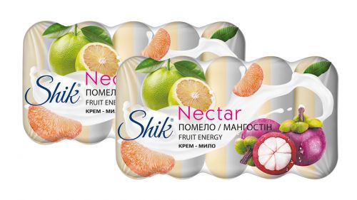 Ексклюзивна лінійка двоколірного мила Shik Nectar складається з двох частин різнобарвного мила: білого та кольорового. Біла частина — туалетне мило з добавкою крему, кольорова частина — туалетне мило з ароматами фруктів.Туалетне тверде крем-мило Shik Nectar з ароматами помело та мангостіна ефективно очищає шкіру, забезпечуючи їй м’якість та зволоження. Завдяки натуральним оліям та витяжкам, мило гарантує ніжний догляд і підтримує природний захисний бар’єр дерми.Антиоксидантні властивості сприяють омолодженню епідермісу та відновлюють його тонус. Мило має кремову текстуру, яка з легкістю утворює багату піну, без зусиль змивається та не пересушує.